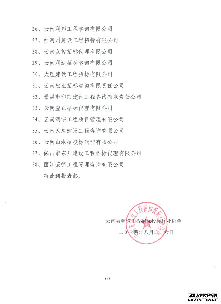 云南美狮会招标咨询有限公司连续三年获得云南省建设工程招标投标行业协会评选的“云南省工程建设项目先进招标代理”。