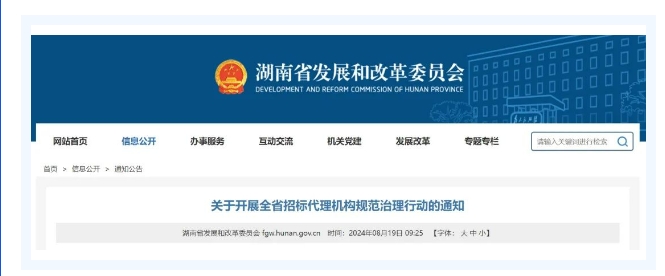 近日,湖南省发展改革委与湖南省住房城乡建设厅、湖南省交通运输厅、湖南省水利厅、湖南省农业农村厅、湖南省生态环境厅、湖南省公共资源交易中心联合印发《关于开展全省招标代理机构规范治理行动的通知》(湘发改法规〔2024〕666号),在湖南省组织开展招标代理机构规范治理行动。
