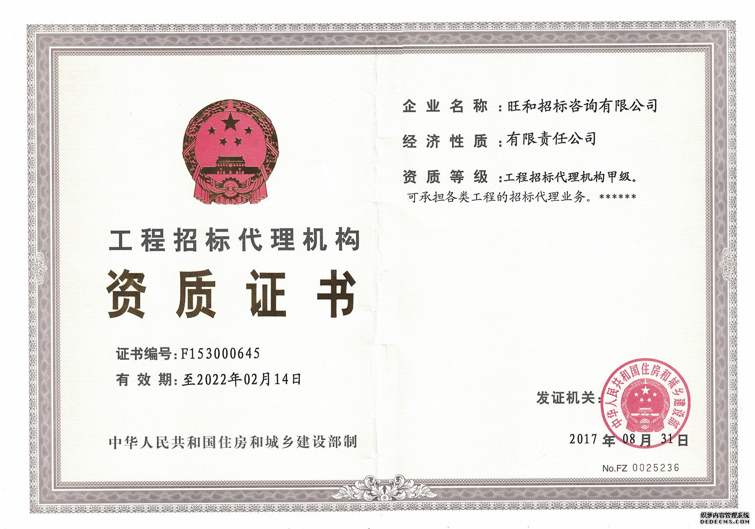 工程招标代理机构甲级资质由中华人民共和国住房和城乡建设部认证颁发,可以在全国范围内承接各类建筑、市政、公路、水利等项目的施工、监理、勘察设计等招标代理业务。